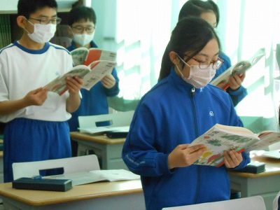 まずは、第5場面の音読から始めます。女の子が雪うさぎにとらわれていく様子を、臨場感あふれるセリフで表現しました。