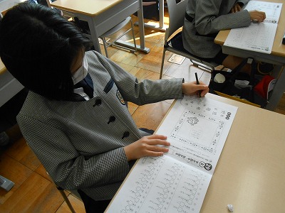 「学→□→問→□→名」のように連続した漢字二字の熟語を当てはめていきます。よく知っている熟語の中に、あまり聞きなじみのない熟語も登場しました。いろんな言葉にふれあいながら、言葉の力を増やしていきます。