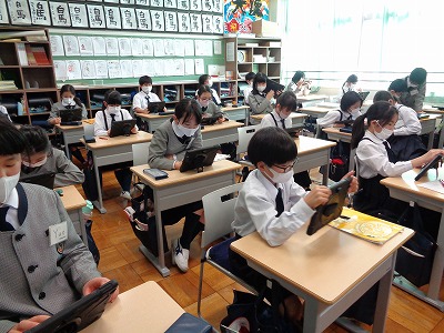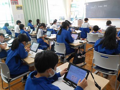 今日の社会では、SDGsの学習を行っています。今日は、17個の目標を達成するために、どんな取り組みが行われているのかを調べて発表しました。