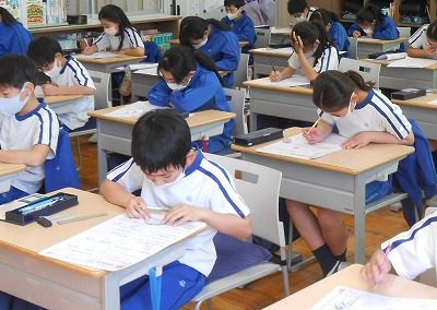算数では、「直方体と立方体」の単元テストを行いました。たくさん行った4年生のテストも、これが最後です!