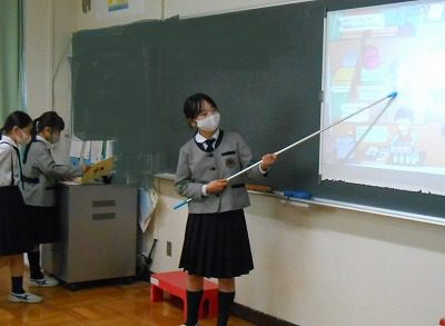防災について書かれた内容でした。みんなが見えるように、スクリーンに映し出して読んでくれました。