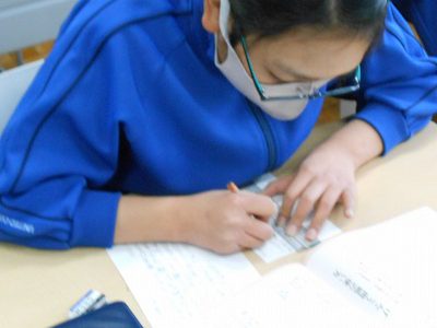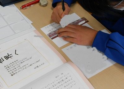 罫線のない真っ白なはがきに、まっすぐ文字を書くのは至難の業です。定規をあてがいながら、真っ直ぐに文字を書けるよう工夫している児童もいました。