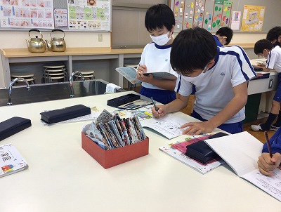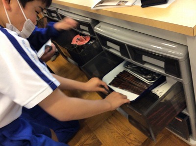 さらに、「ガスコンロの近くに燃えやすい物を置かない」という観点に注目し、ノートや教科書、エコパックの置き場にも注意することを学習しました。
