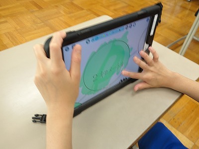5分間走りきると,少し疲れた表情とともに、とてもさわやかに教室まで戻ります。教室に戻ると,タブレット内のカードに、今日走った距離を記録して色を塗ります。