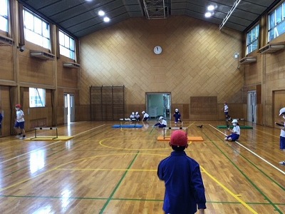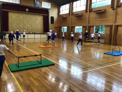 目標タイムを切ることを目指してがんばっているハードル走も、今日で2回目の雨となってしまいました。それでも、今日は体育館で雨の日ならではの練習をしました。