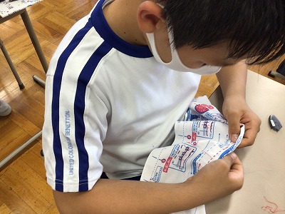 1回ずつ刺して、抜いて…を繰り返すのではなく、2,3回布の間を針が進む様子をレクチャーしました。5年生のみんなは、真剣です。