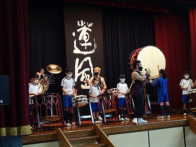 演奏が終わると、各学年2名の合計6名が実際に和太鼓を分担して演奏しました。少し照れや緊張があったようですが、よい体験ができました。