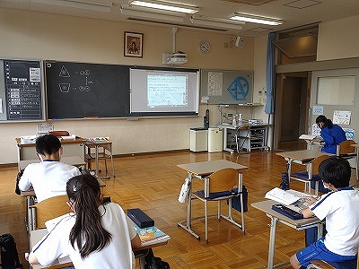 1校時の算数では、今日もコース別に分かれて学習しました。どちらのコースも合同な図形の性質について、対応する頂点や辺、角を探し、それらの長さや大きさが等しいことなどを学びました。2つの図形が合同かどうかについて考えたり、合同な図形を作図したりする学習への基礎的・基本的な学習でした。来週からどんどん楽しくなっていきます。