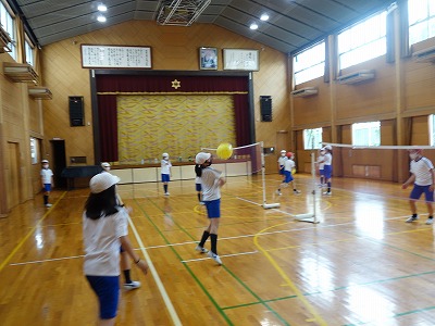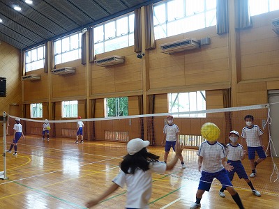 少し感覚がつかめてきたソフトバレーボールですが、まだまだ慣れなくて「まっすぐボールが飛ばない」「とっさのときに、ついつい手が出てしまう」といった声があちこちで聞こえてきます。それでも、真剣な表情の合間に笑顔が絶えず、ほとんどの児童が楽しんで取り組むことができています。