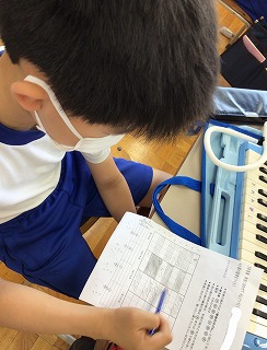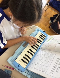 “和音”をもとにしたメロディづくりに取り組んでいます。今日は、4小節分を完成できた友達もいて、「中間発表会」のような時間を過ごしました。