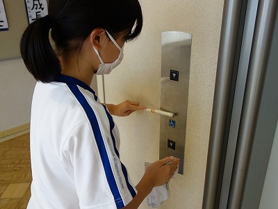 エレベーターのボタンのふちにある隙間は、割りばしにティッシュペーパーを縛り付けた物を使って、拭き取っていました。