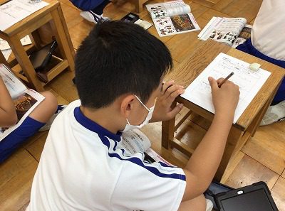 今日は、ロイロノートにその場面の写真を送り合い、「その楽器を調べたい理由」や「調べて分かった特徴」を交流し合いました。