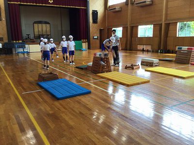 体育は「跳び箱」に取り組んでいます。段数の多い方や、補助台を付け方と、自分に合ったコースで飛び越える力を試していました。