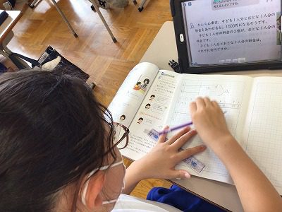 算数は「図を使って考えよう」の学習で、“線分図”をベースに、求め方を説明するための“図”を書いて友達に説明する時間を持ちました。