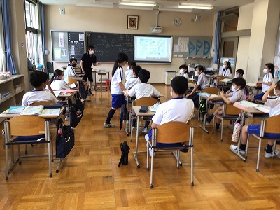 みんなが見守る中、緊張をしつつ活動する5年生。意欲高く、最後まで熱心に取り組みました。