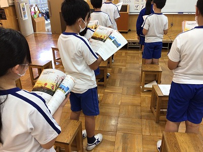音楽では「子守歌」や「民謡」を聞いたり歌ったりすることを通して、日本の伝統的な音楽に触れる学習をしています。