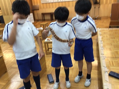 「こきりこ節」は、みんなで歌唱も行いました。学習後は、“ささら”を鳴らしに集まってくれました。