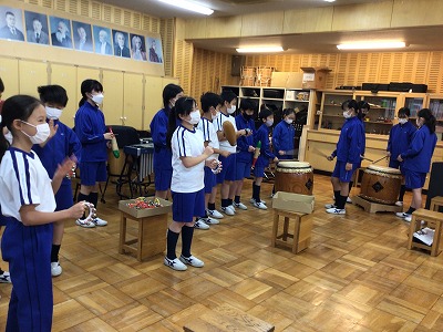 残りの時間で「♪こきりこ節」を歌い、3パターンのリズムを打楽器で演奏し、民謡調に歌うことを楽しみました。