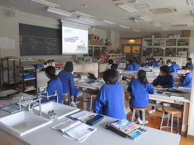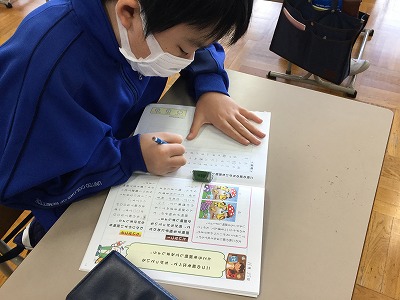 4校時の国語は「思考力トレーニング」テキストに取り組むことから始めました。今日のテーマは「二つの絵」。“そっくり”といいたい所ですが、比べてみると間違いが5カ所あります。「右の絵の○○○は、△△△です。一方、左の絵は…」というように、比較していることを分かりやすく説明することがポイントです。