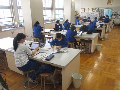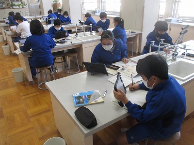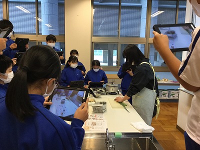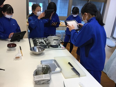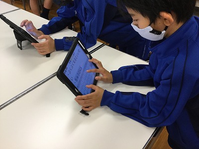 5校時に家庭科室で、調理実習を行う予定で一日が始まりました。「実際に作りたかったなあ」が本音。「タブレットを手に、実習の報告をするのだ」という学習形態を知り、俄然やる気の5年生でした。