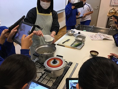 先週の“出汁味比べ”で学習した“煮干し”が今日のお出汁です。その鍋を火にかけて沸騰する間に、ご飯炊き用の鍋に注目し、「洗ったお米」「吸水のポイント」などを確認し、「中火から強火」で炊飯もスタートしました。