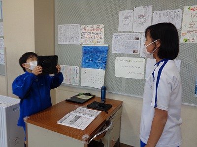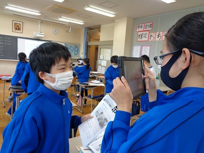タブレットにも、車いす各部の名称や、扱いの注意を記したプリントを配布しています。それと比較しながら、真剣に先生のお話を聞いていました。