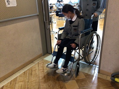 いよいよ、実際に乗ったり押したりを体験する時間です。教室の出入り口は幅が合って通りやすいです。少しの段差も気にならないくらいです。しかし、「後ろ方向に入っていこう」と、慎重に取り組んでくれました。