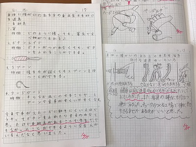 また、車いす体験の順番を待っている間は、体の不自由さを感じている方のために開発、またはひと工夫を施した“自助具”を調べて待つことを課題にしました。