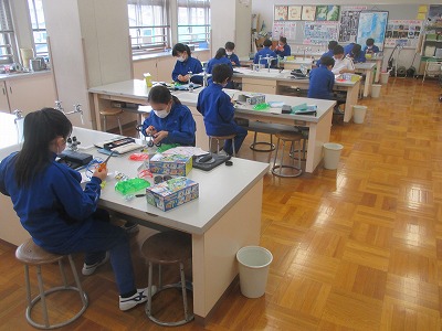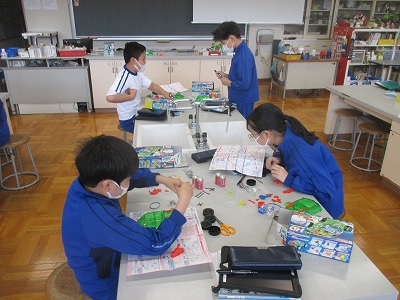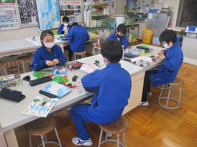 今日はその実験パーツを用意すべく、スイッチ・方位磁石・電池ボックスなど、実験キットを作り、それぞれに名前を書いてもらいました。