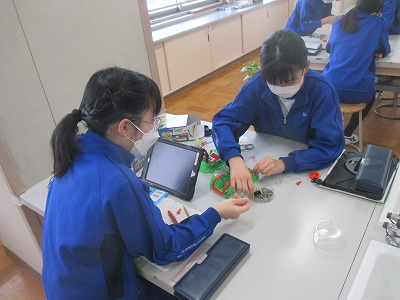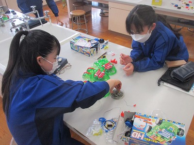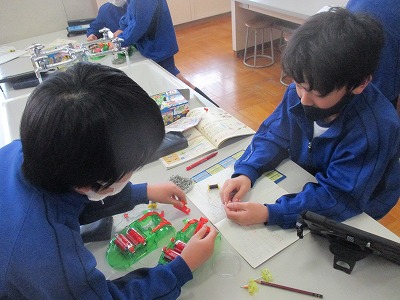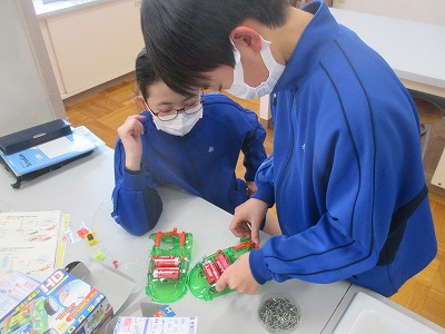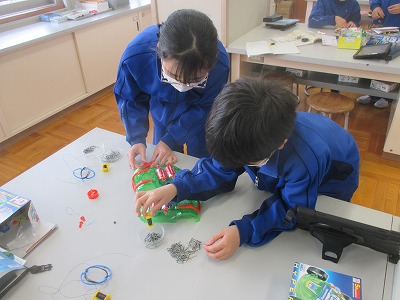 今日は、実験中心の1時間で、これまでの学習を振り返り、2人1組になって、いろいろな実験を組み立てていく中で、磁力の変化を確かめる実験をしています。