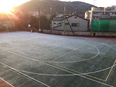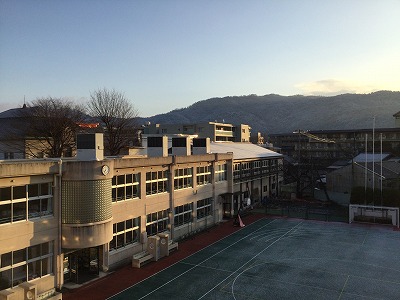 朝日が映す東の山々も、文教キッズのグラウンドも、うっすらと白い布をまとっているようです。