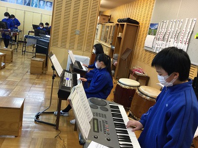オルガンの響きで、中盤のメロデイがはっきりと表現されてきました。低音楽器のボリューム調整を行い、鉄琴の高い音が響きます。合奏の仕上がりも上々です!