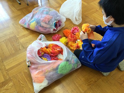 こちらは、委員会担当の仕事中です。会場となる体育館の飾り付けに使える“花飾り”を整えています。そのほかにも、入場ゲートや大文字看板の準備に取り組んでいます。