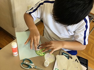 下学年から届いた“クローバーの葉”を集め、班毎に貼り付けて“ブックカバー”の仕上げに取り掛かっています。