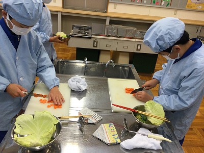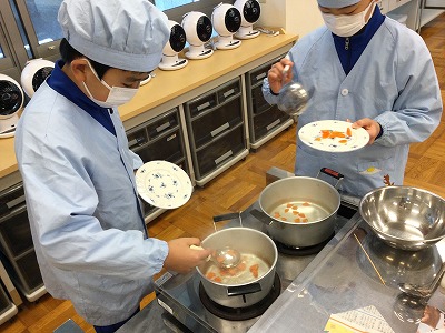 調理実習を行いました。これまでは、先生が行う様子を見学し、ロイロノートに報告する形の学習でした。ようやく学年最後の調理で、ガスコンロや包丁を使う実際の活動に取り組む計画を立てることができました。