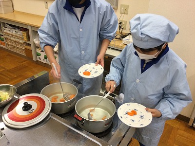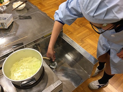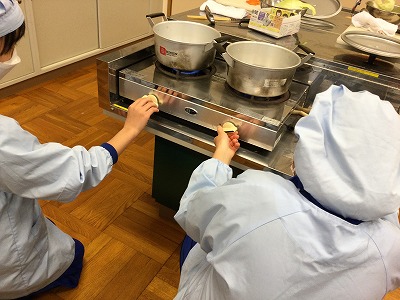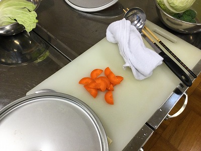昨日に「水からゆでる野菜&湯からゆでる野菜」の学習を済ませているので、まず切り始めるのは“人参から”を合い言葉に“ガスコンロ”へと移動します。