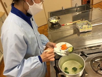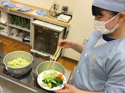 「自分で作って自分で食べる」がポイントです。メニューは「温野菜~3つのソースを楽しもう~」です。材料は、人参・ブロッコリー・キャベツです。