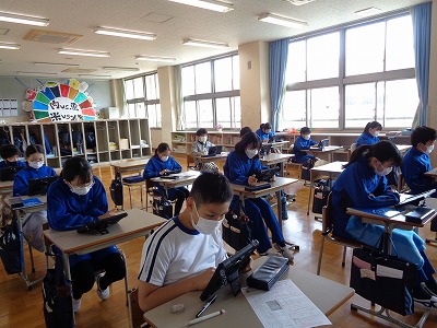 残りの時間は、次時に予定している「5年生のまとめテスト」に備えて、社会の教科書の振り返りをしています。
