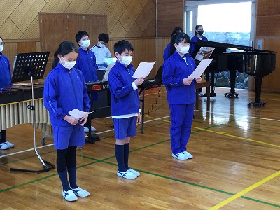 6年生に届ける『2022年ヴァージョン・ルパン三世のテーマ』を演奏する前に、あいさつを準備しています。学級代表さんが、6年生・班長さんの行動や人柄など、うんうんとうなずける横顔を発言し合い、キーワードとして拾い上げた言葉が散りばめられています。