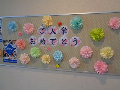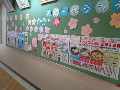 こちらは桜の花びらいっぱいの保健室前 掲示板。