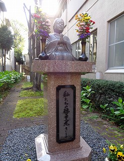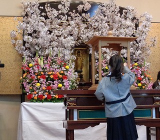 全体写真撮影を終えてから、最後に仏さまに同称十念をお称えして終わりました。1年生達や保護者の方々が、お釈迦様に甘茶をかけました。「仏さま、これから、いろいろな事をがんばります! 見守って下さいね!」