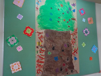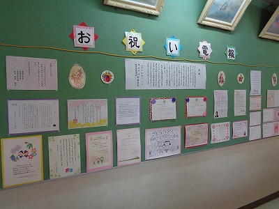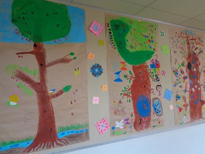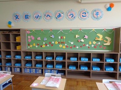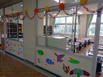 廊下掲示も、文教キッズの作品で、楽しさ明るさ満載です。