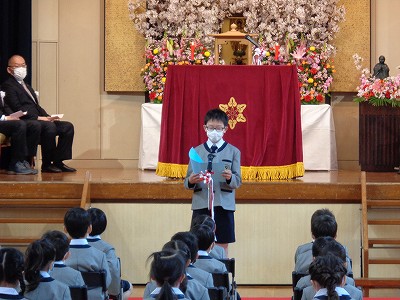 「『明るく 正しく 仲良く』の仏さまの教えを守り、みんなで仲良く、生活することをちかいます。(一部略)」 背筋を伸ばして、はきはき言えました!
