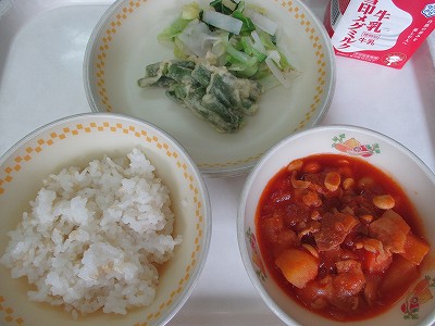ポークビーンズは、じゃがいも、玉ねぎ、人参、豚肉、大豆をトマトピューレで煮込んだアメリカの家庭料理です。トマトピューレやケチャップの酸味がやわらぐように、よく煮込んで調理してあります。おかかあえは、かつお節をたっぷり入れて風味のよい和え物に仕上がりました。