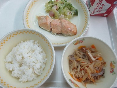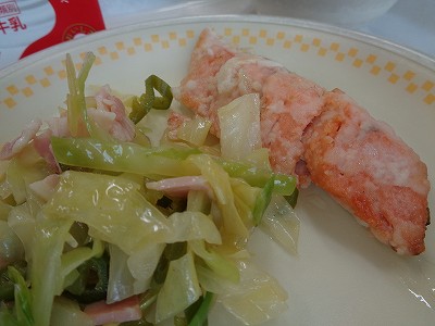 鮭はバターを溶かして混ぜた油でこんがり焼きました。ほんのりバターの香りがします。野菜はキャベツ、ピーマンを使ったソテーです。