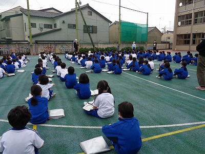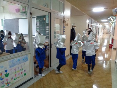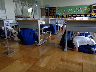 今年度、初めての避難訓練です。地震と火災発生を想定して、お昼の根っこタイムに実施しました。1年生も事前に先生から教えてもらった通りに、机の下にかくれて机の脚を押さえようていました。落下物から身を守ることが、まず大切です。