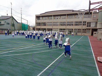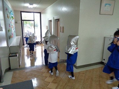 慣れない防災頭巾をかぶって、足下に注意しながら、運動場へ向かいました。