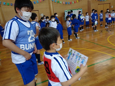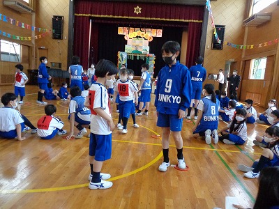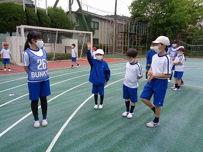 三密を避け、体育館と運動場に分かれて、相談・練習タイムを持ちました。