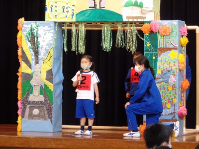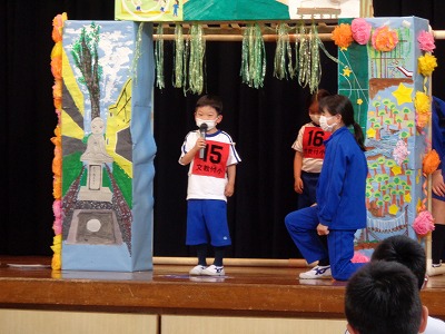 1年生の音読発表「いちねんせいの うた」と合唱「世界中の子ども達が」を聞きました。