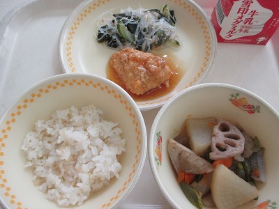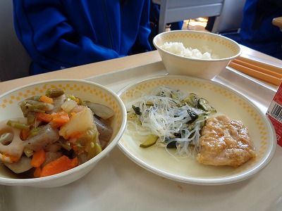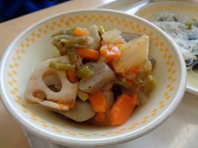 大根やれんこんなど、根菜がたっぷり入った煮物です。